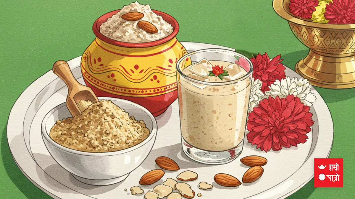 Normally Akshaya Tritiya also marks the birthday of Lord Parshuram as Chiranjeevi Tritiya. Akshaya Tritiya has a peculiar tradition in Nepal, this is called a Sattu day too. Well, let me explain this ancient beverage today, this is a nutritious mix of ground pulses and cereals. Literally, anything roasted and ground into a fine powder is called Sattu, this typical Sattu is made of barley, chickpea, and other grains and mixed with sugar and water. This is an easy to carry, easy to digest and sturdy food, from the context of Krishna and Sudama to the ancient times and various stages of human civilization, it has been customary to take Sattu on a journey.